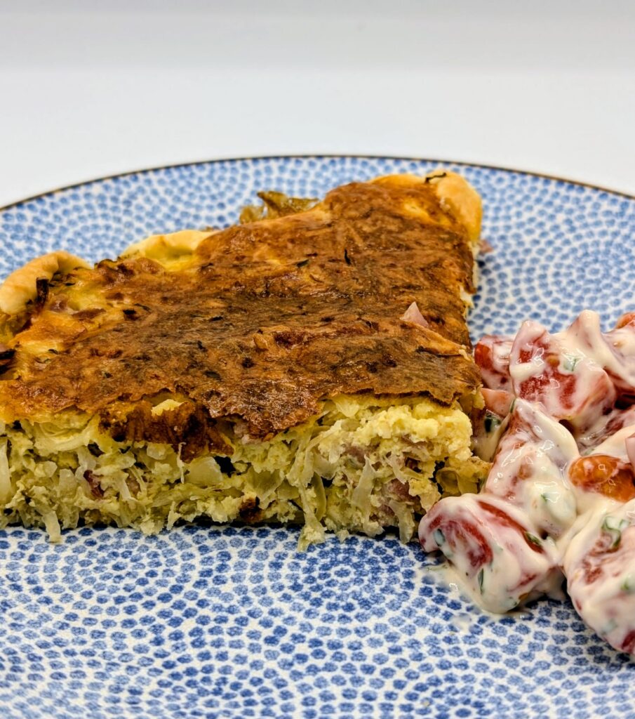 Deze zuurkooltaart is echt heerlijk comfort food. De combinatie van het zoute van de spekjes, het frisse van de zuurkool en de romige vulling maakt dit gerecht een feestje op tafel. En het fijne is: hij staat zó in de oven! Serveer er de frisse tomatensalade bij voor wat extra groenten. Geniet er lekker van ♥